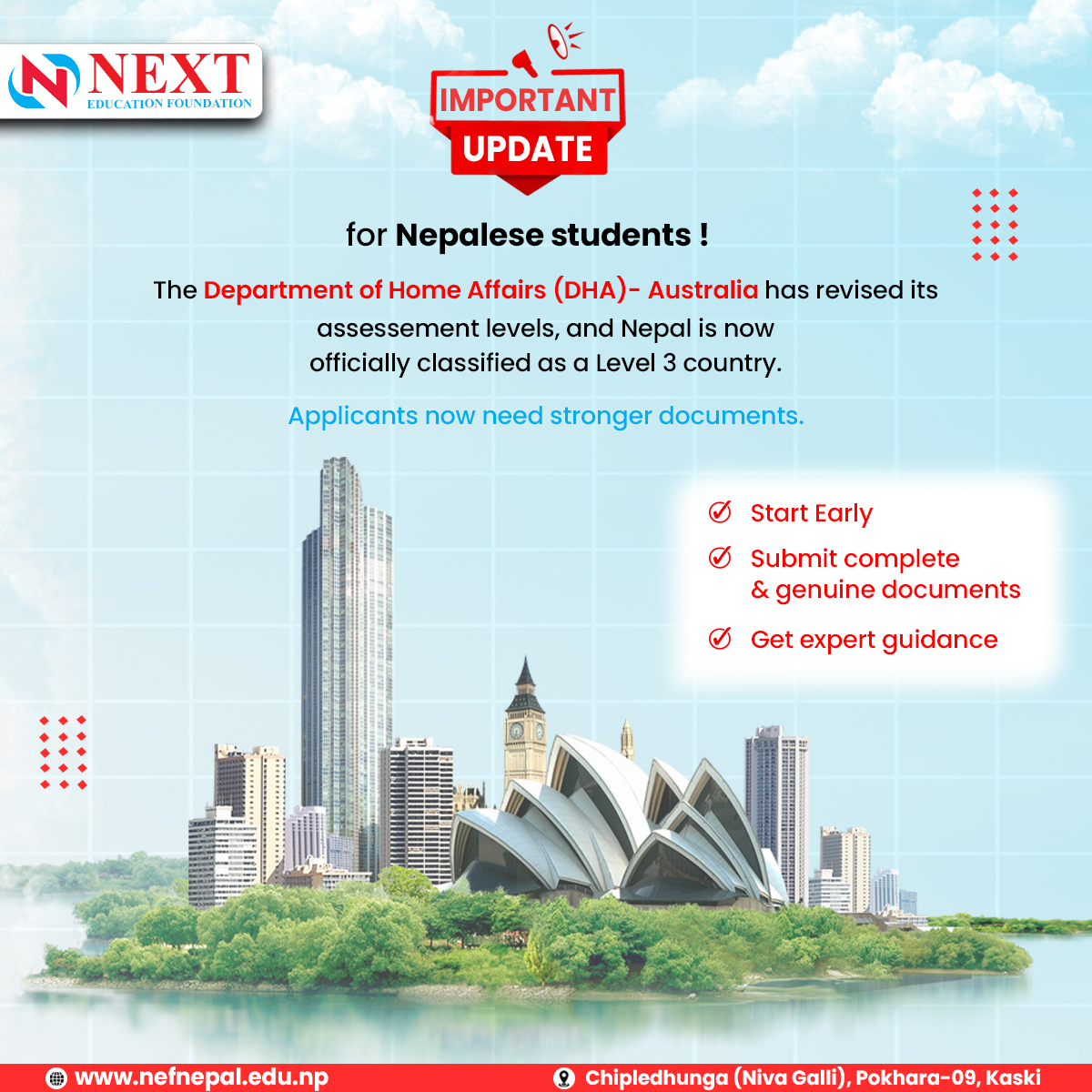 The Department of Home Affairs, Australia, has recently updated its student visa assessment framework, and Nepal has now been moved from Assessment Level 2 (AL2) to Assessment Level 3 (AL3). This change has important implications for Nepali students planning to study in Australia.